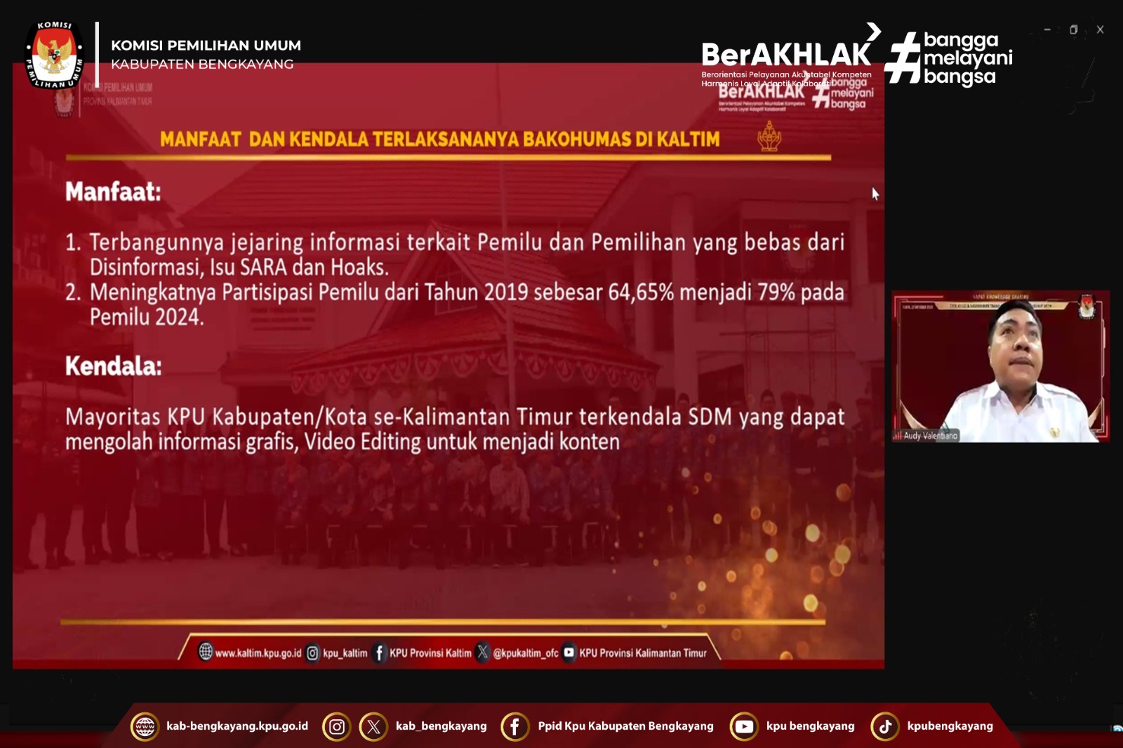 Dalam kegiatan ini, narasumber dari KPU Provinsi Kalimantan Timur, yang baru-baru ini meraih penghargaan Bakohumas Terbaik Ketiga, membagikan pengalaman dan praktik baik dalam pengelolaan kehumasan di lingkungan KPU.