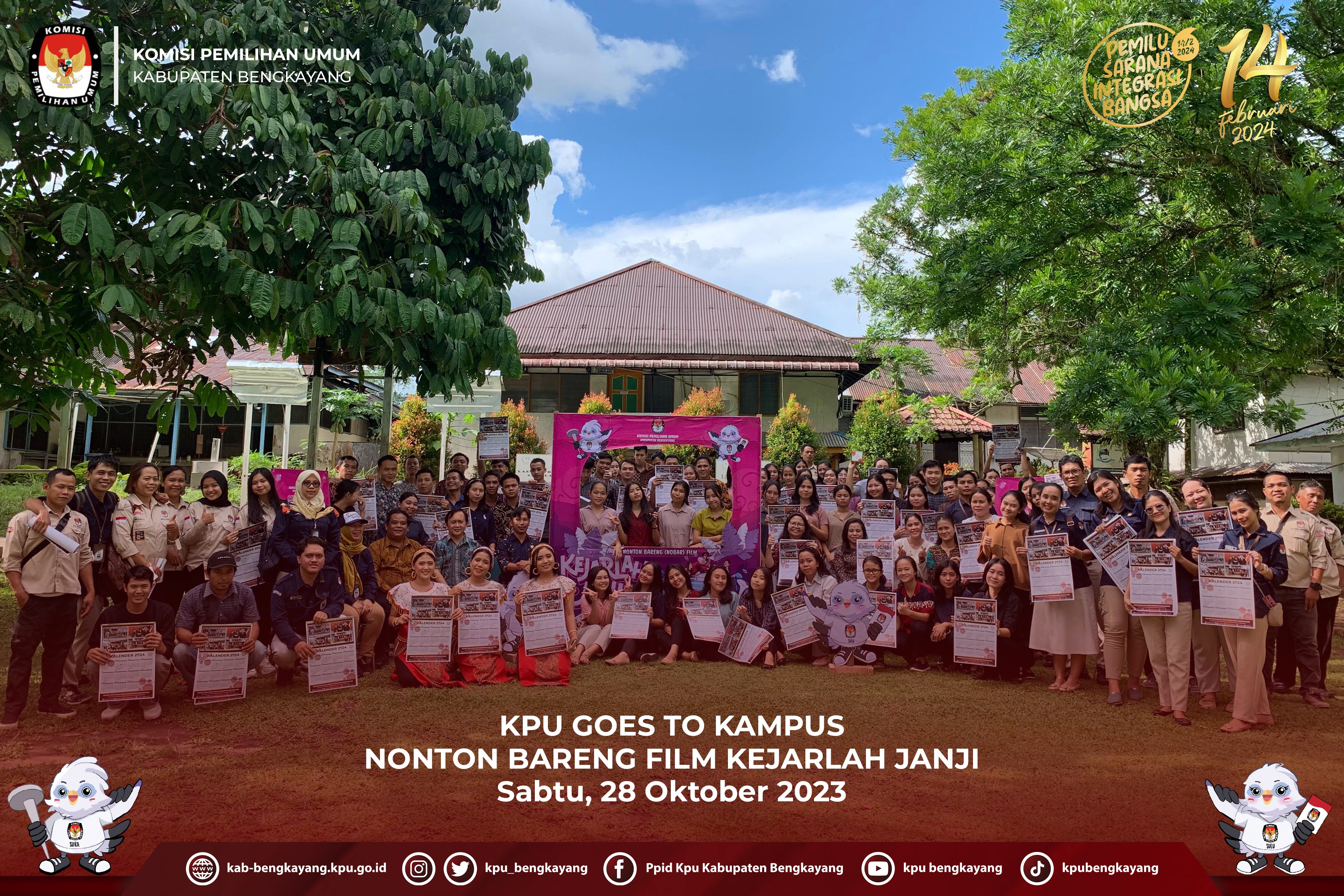 KAB-BENGKAYANG.KPU.GO.ID - Komisi Pemilihan Umum Kabupaten Bengkayang melakukan Sosialisasi dalam bentuk Nobar (Nonton Bareng) Film Kejarlah Janji di Akademi Perawat Bethesda Serukam Kecamatan Samalantan, Sabtu (28/10/2023). Mujidi, Anggota KPU Kabupaten Bengkayang mengatakan, pihaknya menindaklanjuti Surat Dinas KPU RI Nomor 1015/PP.06-SD/09/2023 tertanggal 21 September 2023 dalam rangka meningkatkan partisipasi masyarakat dan mendukung tahapan Pemilu Serentak Tahun 2024. "Go To Campus dengan Nobar (Nonton Bareng) Film Kejarlah Janji yang dibuat oleh KPU RI di Akper Bethesda Serukam," terang Mujidi yang juga Ketua Divisi Perencanaan, Data dan Informasi KPU Kabupaten Bengkayang. Ia mengatakan, pihaknya juga telah melakukan Nonton Bareng Film Kejarlah Janji di Pondok Pesantren An Nur Sungai Duri Kecamatan Sungai Raya, Minggu (22/10/2023) lalu dalam rangka hal yang sama sekaligus memperingati Hari Santri. "Terimakasih kepada Manajemen Akper Bethesda Serukam dan Pondok Pesantren An Nur Sungai Duri karena mengizinkan kami melakukan sosialisasi," ungkap Yopi Cahyono, Ketua Divisi Sosialisasi, Pendidikan Pemilih, Partisipasi Masyarakat dan SDM KPU Kabupaten Bengkayang. Dikatakan Yopi-Sapaan akrabnya, para santri dan mahasiswa merupakan generasi z. Dimana mereka sebagai pemilih pemula dan pemilih muda pada Pemilu Serentak Tahun 2024 mendatang. Tentunya membutuhkan informasi yang banyak terkait Pemilu. "Salah satu tugas kami ialah memberikan sosialisasi kepada masyarakat terkait Pemilu terutama kepada generasi muda dan pemilih muda," ucapnya. (Humas KPU)