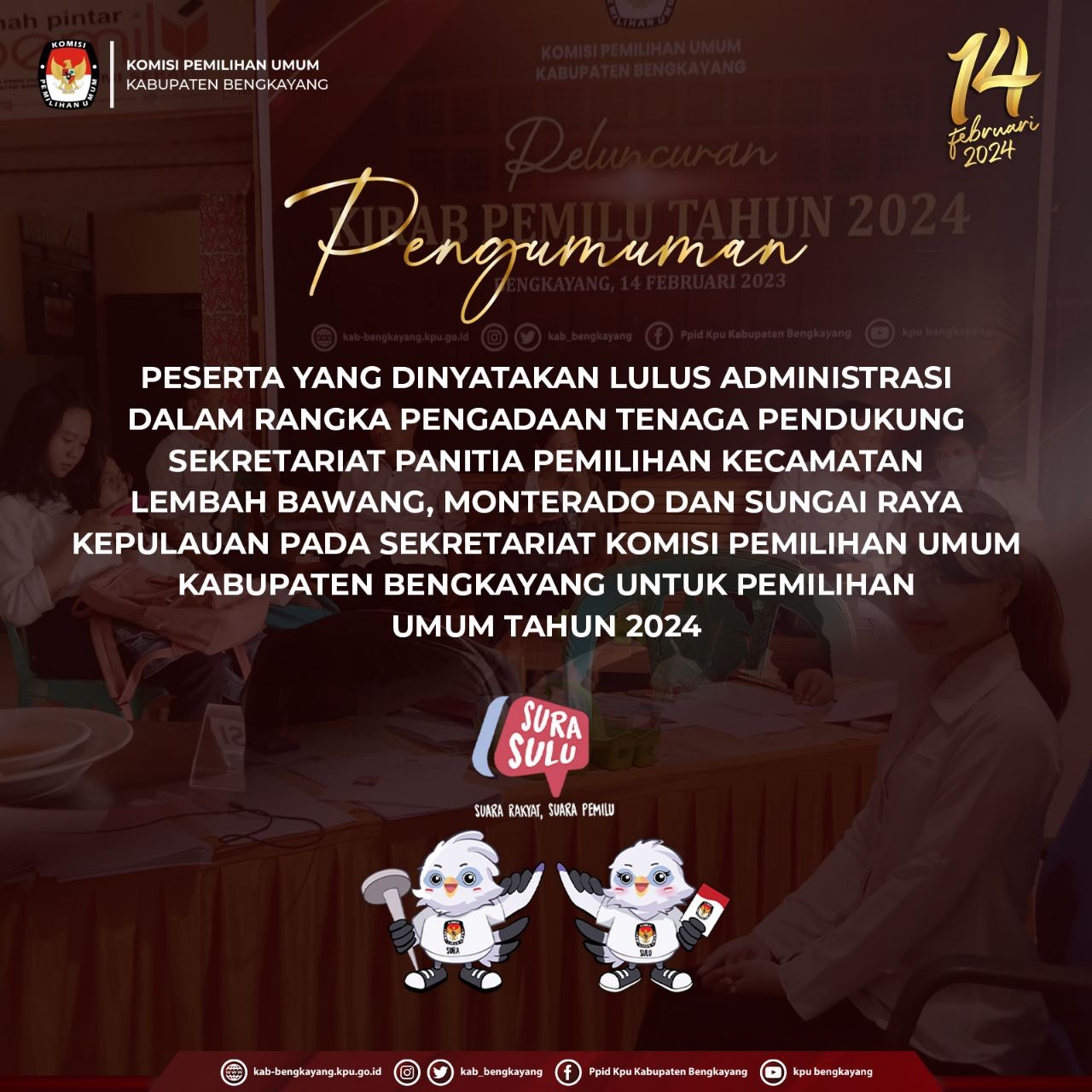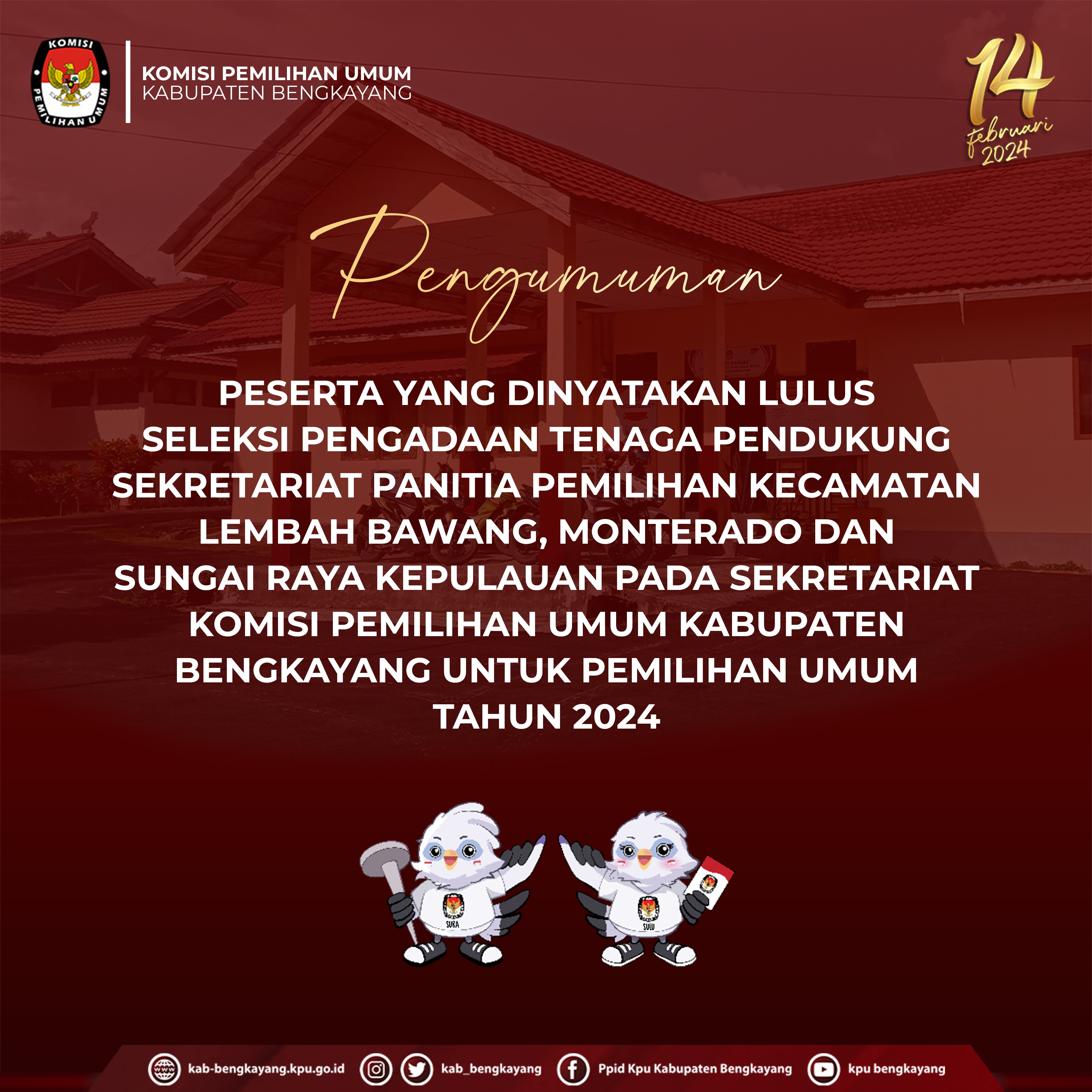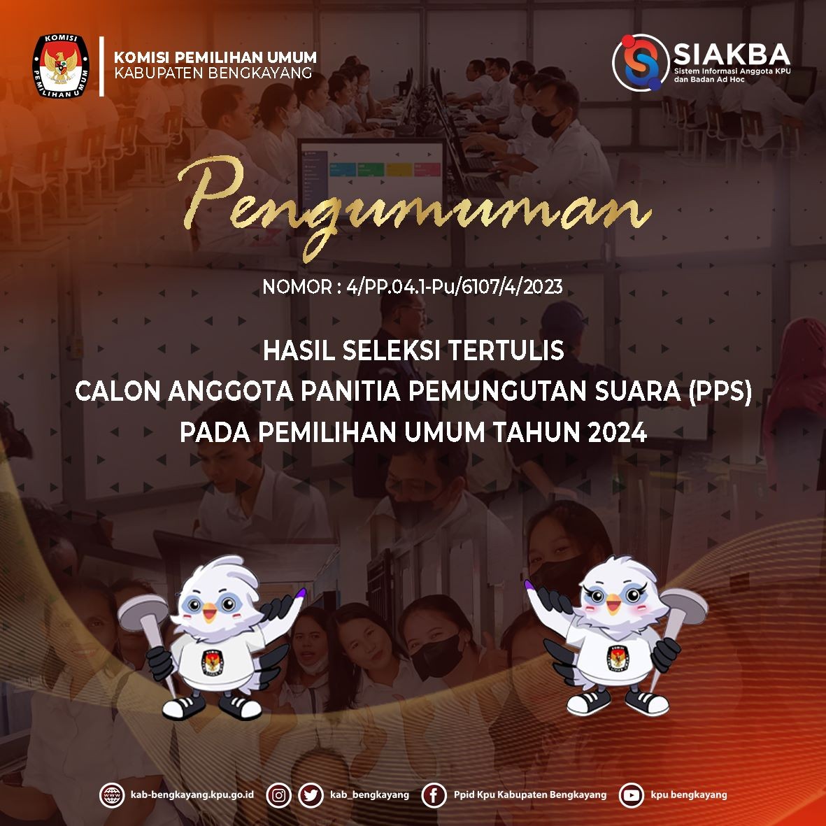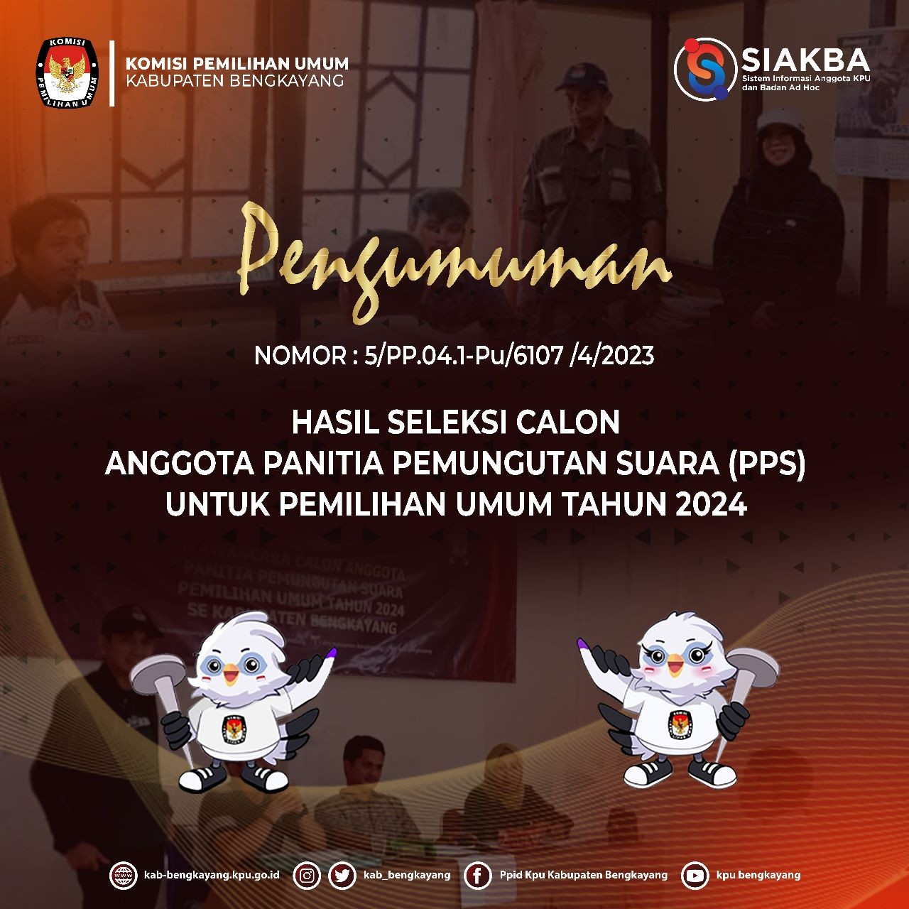 Berdasarkan Berita Acara Rapat Pleno KPU Kabupaten Bengkayang Nomor 57/PP.04.1-BA/6107/2023 tanggal 21 Januari 2023 tentang Hasil Seleksi Calon Anggota Panitia Pemungutan Suara (PPS) Pada Pernilihan Umum Tahun 2024, disampaikan hai-hal sebagai berikut: