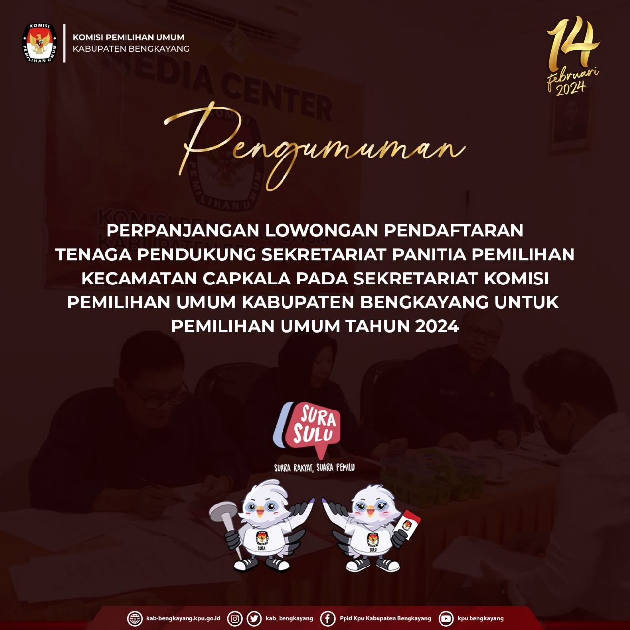Sehubungan dengan bal tersebut di atas, KPU Kabupaten Bengkayang mengundang calon Anggota Panitia Pemungutan Suara terpilih (peringkat 1 sampai dengan peringkat 3) untuk hadir dalam pelantikan, pengambilan sumpah/janji dan penandatanganan Pakta lntegritas Anggota Panitia Pemungutan Suara pada: