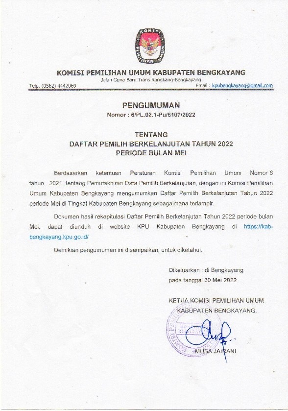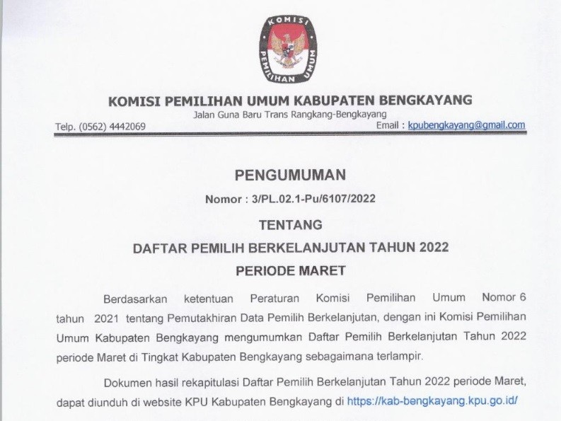 PENGUMUMAN DAFTAR PEMILIH BERKELANJUTAN PERIODE BULAN MEI 2022 Selasa, 31 Mei 2022 00:00 964 DPB Bulan Mei Tahun 2022 <<Download>> Baca Selengkapnya