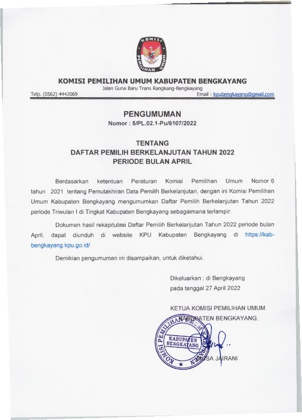 PENGUMUMAN DAFTAR PEMILIH BERKELANJUTAN PERIODE BULAN APRIL 2022 Rabu, 27 April 2022 00:00 972 << DPB BULAN APRIL TAHUN 2022.pdf >> Baca Selengkapnya