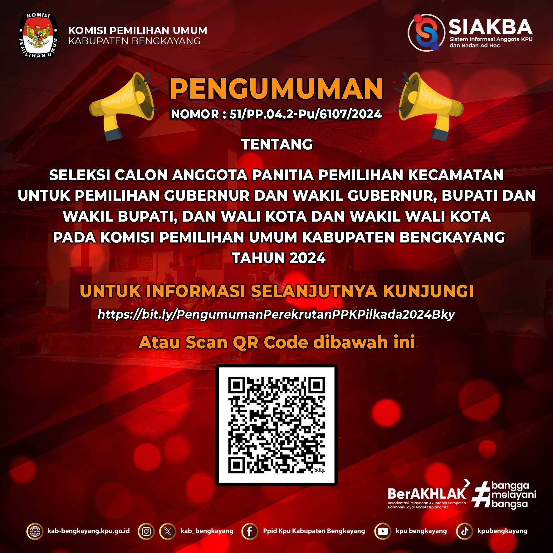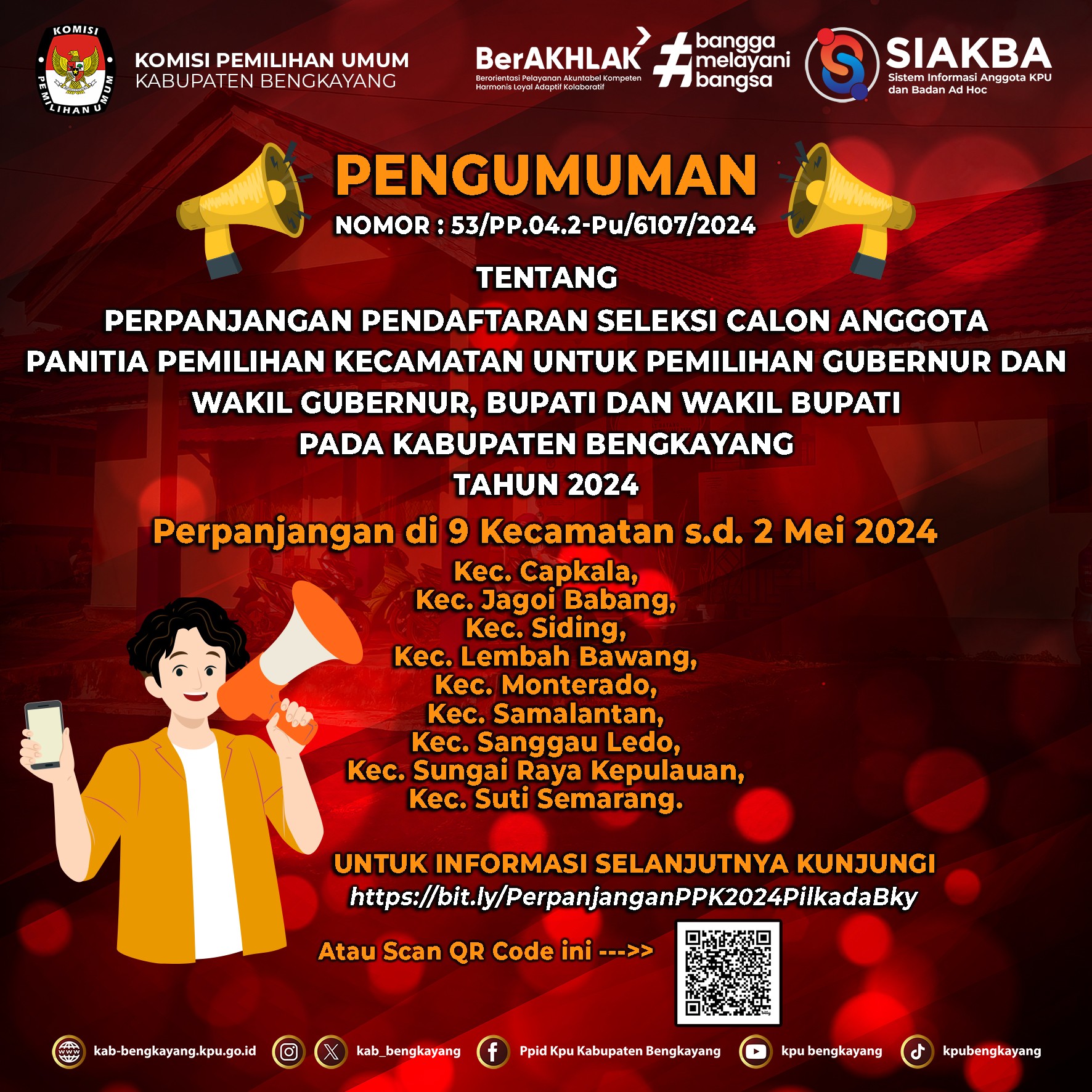 kab-bengkayang.kpu.go.id – Berikut disampaikan Pengumuman Nomor : 51/PP.04.2-Pu/6107/2024 tentang Seleksi Calon Anggota Panitia Pemilihan Kecamatan untuk Pemilihan Gubernur dan Wakil Gubernur, Bupati dan Wakil Bupati, dan Wali Kota dan Wakil Wali Kota Pada Komisi Pemilihan Umum Kabupaten Bengkayang Tahun 2024.